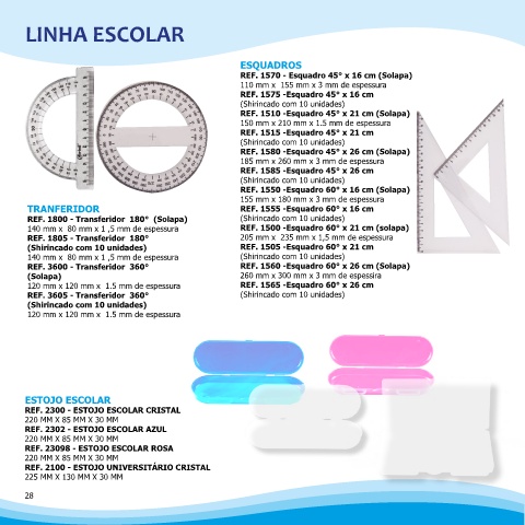 120 mm x 120 mm x 1.5 mm de espessura REF. 1565 -Esquadro 60° x 26 cm 2490 - RÉGUA 30/TRANF.180º/ESQ.
